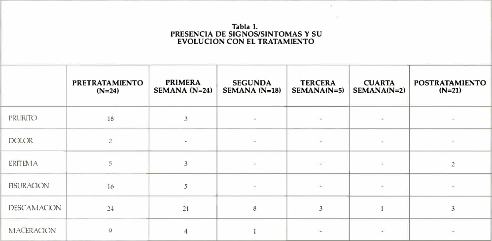 A la semana de la primera dosis, 3 de 24 pacientes se consideraron clínicamente curados; sin embargo, en 14 el micológico directo era negativo y el cultivo negativo en 13. A los 19 en los que se encontró solamente mejoraría clínica, se administró una segunda dosis. Al siguiente control se consideraron clínicamente curados 9 y con marcada mejoría clínica otros 5, pero microbiológicamente fueron negativos 14 pacientes en el directo y 15 en cultivo. De los 5 restantes, 2 recibieron innecesariamente una tercera y cuarta dosis por persistencia del cuadro clínico, pero los exámenes microbiológicos fueron negativos.