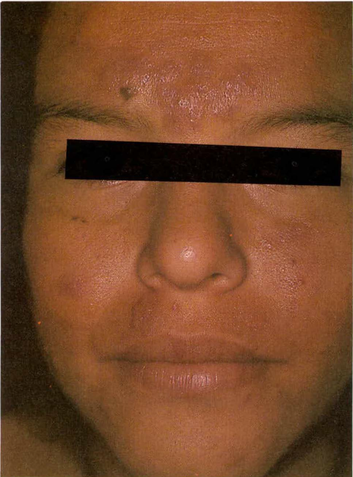 Mujer de 24 años, con cuadro de 9 años de evolución, consistente en pápulas y pústulas recurrentes, que confluyen formando placas en cara y miembros superiores, pruriginosas, que sanan dejando hiperpigmentación y luego aparecen nuevas, con extensión periférica. La histopatología revela infiltrado inflamatorio perifolicular, compuesto principalmente de eosinófilos. El hemograma muestra eosinofilia de 8%. Responde a tratamiento con dapsona. Estos hallazgos son consistentes con la foliculitis pustulosa eosinofílica descrita inicialmente por Ise y Ofuji en 1965.