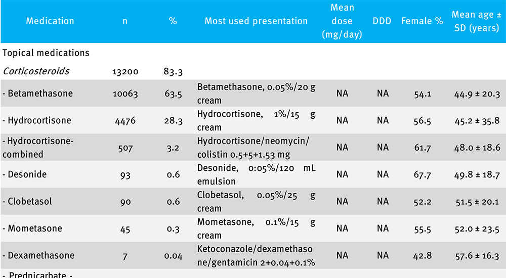 Material y métodos: se realizó un estudio observacional que analizó los registros de prescripción entre enero y diciembre de 2017, de pacientes con diagnóstico de dermatitis atópica, con edad mayor de 18 años. Se evaluaron variables sociodemográficas y farmacológicas (corticosteroides tópicos y sistémicos, inhibidores de la calcineurina, inmunomoduladores y antihistamínicos); además, los medicamentos concomitantes. Resultados: se identificaron 15839 pacientes con dermatitis atópica, con edad media de 43,5±25,8 años y mayoría de mujeres (63,7%). Se estimó una prevalencia del 0,3% de adultos registrados en 2017 y una incidencia de 361,0 casos nuevos por cada 100.000 personas año. Los corticosteroides tópicos fueron los medicamentos más prescritos (84,4%), seguidos por los antihistamínicos (59,3%), los corticosteroides sistémicos (32,6%), los inmunomoduladores (1,7%) y los inhibidores de la calcineurina (1,2%). El 56,8% de los pacientes recibían terapia combinada.
