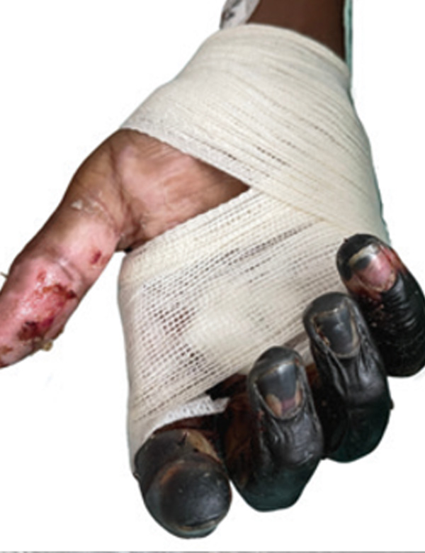 Presentamos el caso de un paciente con meningococcemia asociado a púrpura fulminante que requirió de amputación transtibial bilateral más amputación de las falanges distales de ambas manos.