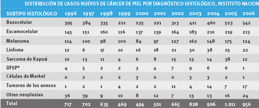 En este artículo se resume la información de los diagnósticos nuevos de cáncer de piel correspondientes al período 1996-2010 en el Instituto Nacional de Cancerología, centro de referencia en cáncer a nivel nacional, en donde se evidencia un