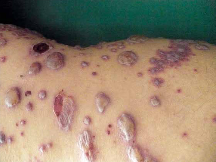 Presentamos el caso de una paciente de 36 años con diabetes mellitus de tipo 2 y lesiones ampollosas pruriginosas en miembros inferiores de tres semanas de evolución. Las pruebas de glucemia, perfil lipídico y proteinuria estaban alteradas. El estudio histopatológico reveló ampollas intraepidérmicas y vasculitis leucocitoclástica. En la inmunofluorescencia directa se encontró un depósito de IgA perivascular. Se diagnosticó púrpura de Henoch-Schönlein, y se inició tratamiento con esteroides orales a 1 mg/kg de peso durante ocho semanas. No